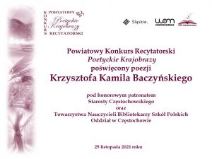 25 listopada 2021 roku w Regionalnym Ośrodku Doskonalenia Nauczycieli „WOM” w Częstochowie odbył się Powiatowy Konkurs Recytatorski „Poetyckie Krajobrazy”, poświęcony poezji Krzysztofa Kamila Baczyńskiego.